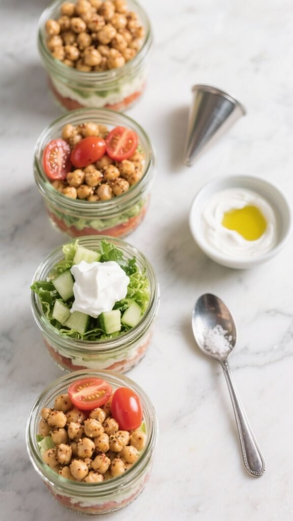 - Layer four jars: yogurt dressing on the bottom, then chickpeas, tomatoes, cucumber, and greens on top.