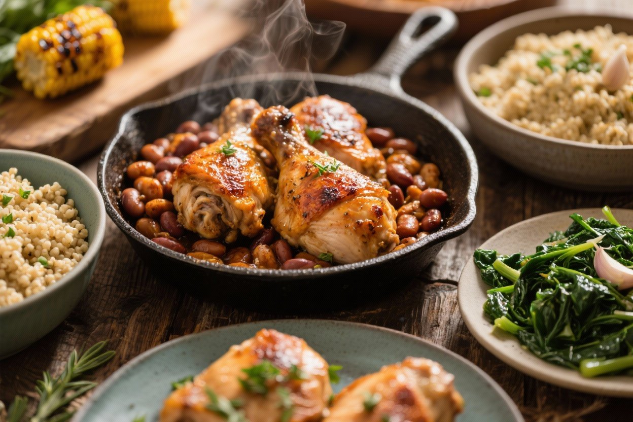 - Brown the chicken: Pat thighs dry and heat oil in a large skillet over medium-high. Sear chicken skin-side down 5–7 minutes, flip, cook 4–5 more minutes. Remove to a plate.